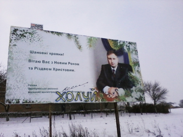 Білборд із новорічним привітанням гаранта стоїть якраз біля траси – його видно ще здалеку. Обличчя та шию Януковича замалювали синім. Хтось також вивів жирними літерами слово "Зек" під слоганом "Вітаймо рік-2012! Цей рік відкриє Україну для Європи та світу". Поруч жовтим написано побажання - "Геть!"