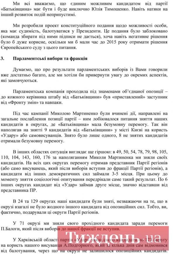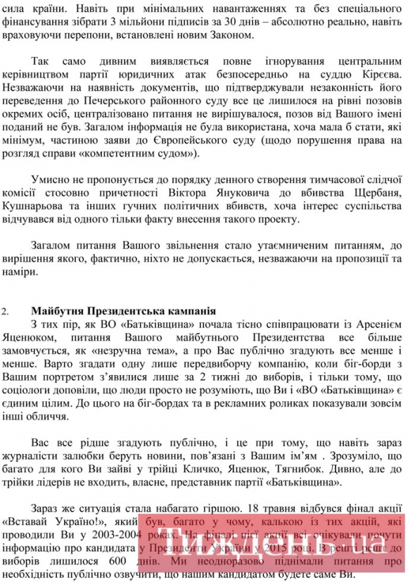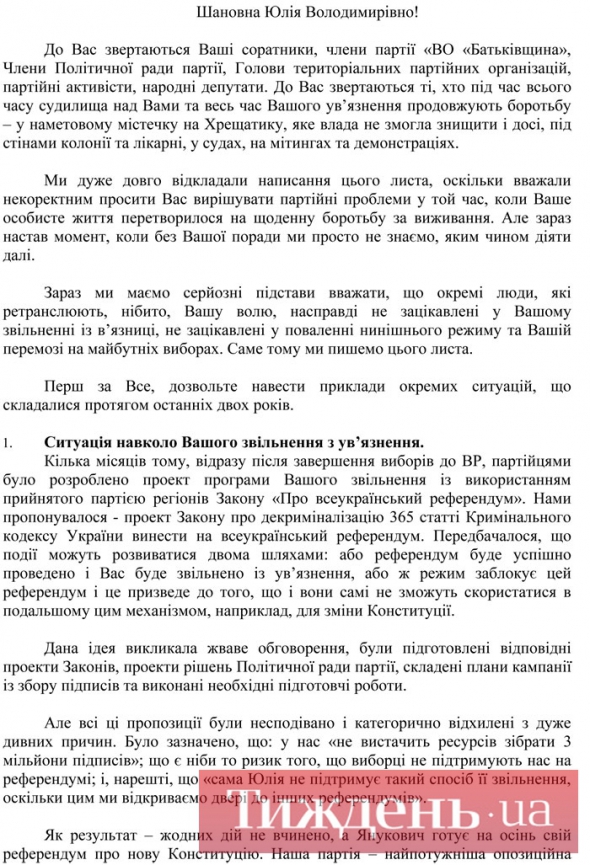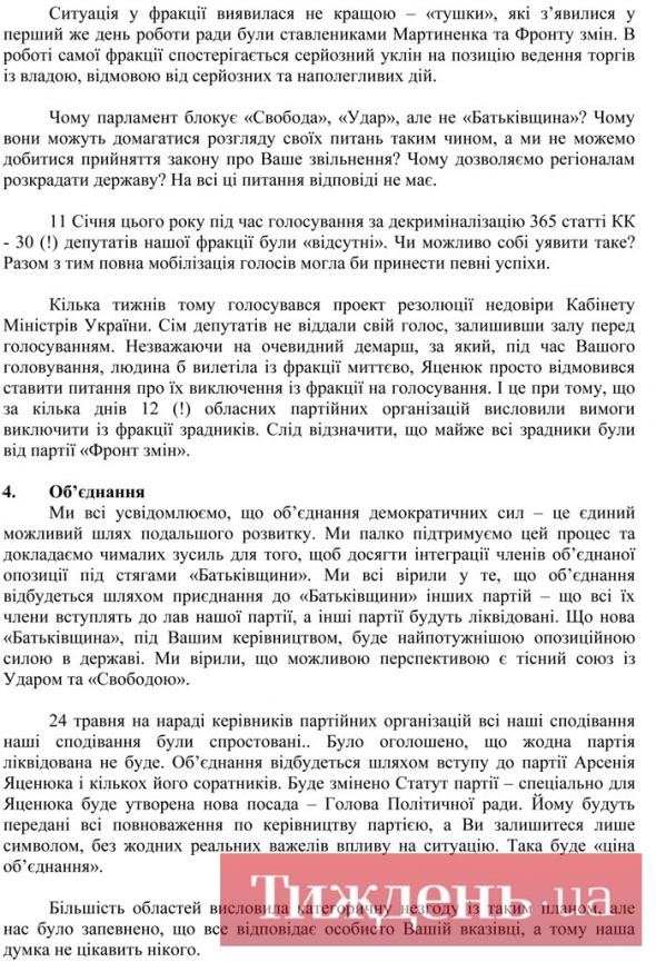 Незадовго до об'єднавчого з'їзду "Батьківщини", на якому має остаточно оформитись лідерство "Фронту змін", значна частина старих соратників Тимошенко зважилась на сміливий крок: вони надіслали екс-прем'єрці листа, в якому детально описали гнітючу ситуацію, що склалася у фракції та партії, вказали на винуватців – Яценюка та Мартиненка, та спитали у Тимошенко поради, як діяти далі.