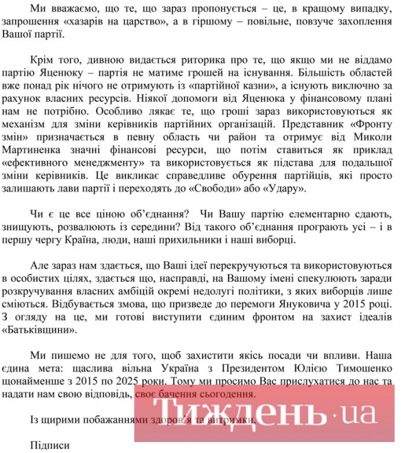 Підписали лист 12 керівників обласних партійних організацій "Батьківщини" (саме ті, що нещодавно вимагали виключити з фракції кількох депутатів, що пройшли за квотою "Фронту"), приблизно третина членів політради, яка складається з шістдесяти осіб, та рядові партійці.