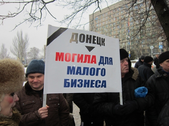 Люди тримали плакати: "Донецьк - могила для малого бізнесу", "Досить нас вбивати і труїти дурними ідеями", "Чиновники, займіться справою, а не терором", "Лук'янченка під суд", "Лактіонов і Лук'янченко, припиніть беззаконня проти дітей школи № 111".