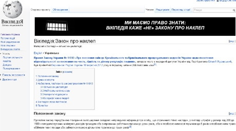 Українська версія вільної енциклопедіїї "Вікіпедія" протестує проти закону про наклеп та приєдналася до акції протесту, розмістивши банер із написом "Ми маємо право знати: Вікіпедія каже "НІ" закону про наклеп".