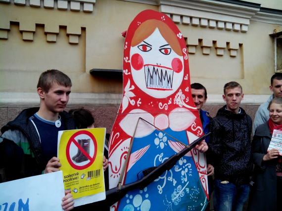 До будівлі асоціації по вулиці Артема 26, активісти прийшли з двометровою зубатою матрьошкою озброєною гвинтівкою. Її супроводжували кілька десятків людей з плакатами про бойкот товарів з Росії. Усе дійство супроводжувалось під пісню білоруської групи Ляпіс Трубецкой - "Матрьошка".
