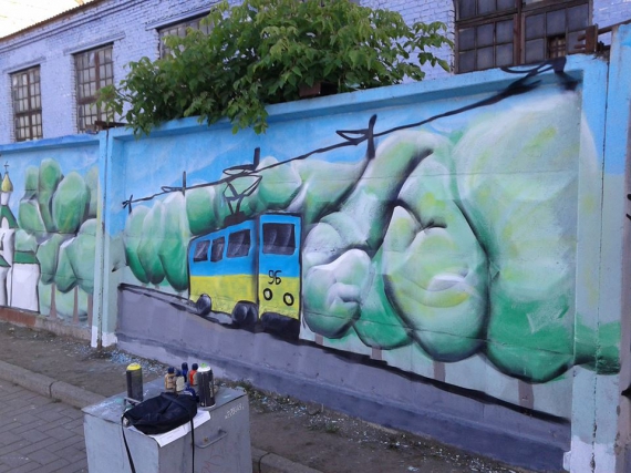 "Проект задумували як патріотичний та іміджевий. Малюнки бачили пасажири з вікон поїздів Москва-Київ, які прибувають на четверту платформу вокзалу, - розповідає Андрій Рошкован, - директор місцевої телекомунікаційної компанії "Зурбаган", котра виділила 3 тис. грн. на водостійку фарбу для графіті. Діти намалювали конотопську церкву Різдва Богородиці, пам'ятник коню та бульвар. Також — інші відомі жителям Конотопа місця. Трамвай зобразили у жовто-блакитних кольорах.