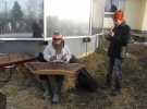 Біля входу в приміщення музею – тюки сіна. Двоє музик в українських національних костюмах грають на цимбалах. Поруч стоїть трактор із причепом. Один із музикантів – організатор свята художник Юрій Рафалюк. Чоловік два роки проживає в селі. Раніше жив і працював у Львові.