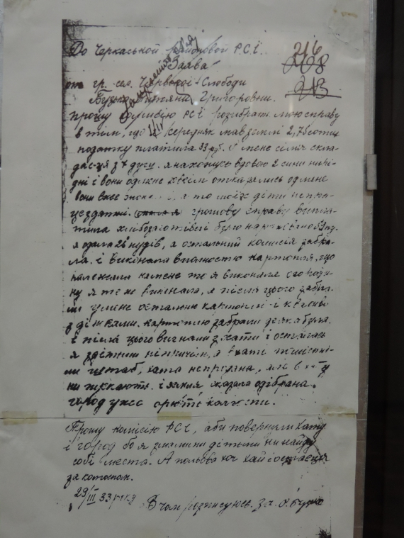 Ще в 90-х роках очевидці надсилали спогади прямо у музей. З архіву є заяви від людей, про те, що нічого їсти. Є фото жінки з коровами, по яких видно, що вони недоїдають, виснажені. Фотографія, де стріхи зняли з хат, щоб обмолотити покрівельну солому. Це робили, щоб отримати якісь залишки зерна і щось з нього приготувати", - говорить Тетяна Григоренко, старший науковий працівник Черкаського краєзнавчого музею.