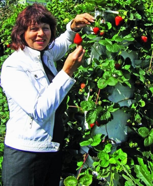 — Налив у бутель води й не заглядаю три-чотири дні. Сама собі поливається. Дуже вигідно тим, хто щодня на дачу не може їздити. Отаке можна й на балконі поставити. Місця мало займає. Я зі своїх колон до 40 кілограмів ягід знімаю. Можна й більше, але в мене є ремонтантні сорти. Після першого врожаю наступні квіти обриваю, щоб рослина відпочила. Вже з третіх — знов ягоди. Може до Нового року плодоносити, якщо в тепло занести й поставити біля вікна. Любить світло.