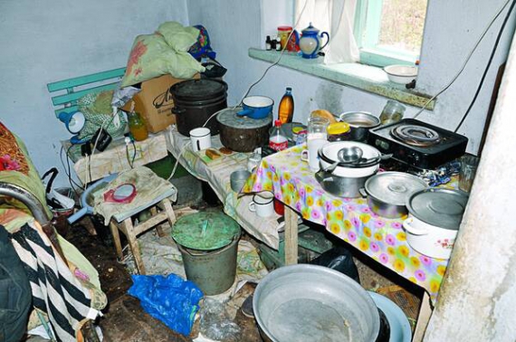 Жінка живе в кухні — 1,5х2 м. Повітря тут важке. Ліжко підсунуте до груби. Над ним сушаться штани і шкарпетки. Посеред кімнати — помийне відро й судно.