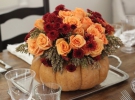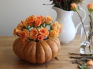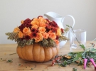 З гарбуза на Хелловін роблять кумедні пички, вирізаючи на них отвори у вигляді очей і рота. Після цього в гарбуз ставлять запалену свічку. Але, якщо ви любитель класичного стилю і страшні атрибути свята ніяк не вписуються в ваш інтер'єр, пропонуємо вам зробити оригінальну екібану з гарбуза і квітів.