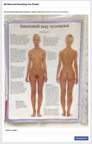 "Модератор зустрічі повідомив, що найпопулярнішим запитанням, яке набрало 45 тисяч лайків, було саме про Україну, і поставив його користувач з Ізраїля на ім'я Григорій. Користувач поскаржився на несправедливість при блокуванні сторінок і дописів з боку Facebook, пояснюючи це тим, що український сегмент курує російський менеджмент. ... Марк Цукерберг прокоментував, що дійсно було кілька дописів, які вони вирішили видалити за порушення правил, що забороняють використання "мови ненависті" проти іншої національності. ... Звучали також запитання, чи дописи, зроблені українцями, модеруються росіянами в час, коли між Україною та Росією триває конфлікт. Це не відповідає дійсності – у нас немає такого російського офісу. Тому кожен, хто думає, що модерація відбувається з російського офіса анти-українськими модераторами, помиляється," – запевнив Цукерберг. ... Він пояснив, що модерацію здійснюють працівники представництва компанії у Дубліні, які володіють мовою, якою зроблено допис".