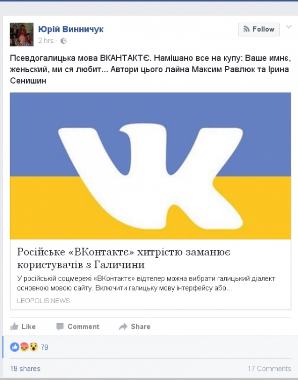 Український літератор Юрій Винничук теж не сприйняв нововведення від розробників ВКонтакті. Про це він написав на своїй сторінці у Facebook: "Псевдогалицька мова ВКАНТАКТЄ. Намішано все на купу: Ваше имнє, женьский, ми ся любит... Автори цього лайна Максим Равлюк та Ірина Сенишин".