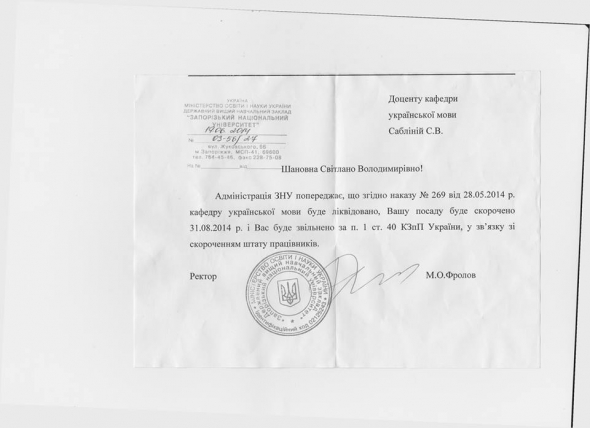 В повідомленнях написано: "Адміністрація ЗНУ попереджає, що згідно наказу № 269 від 28.052014 р. кафедру української мови буде ліквідовано, Вашу посаду буде скорочено 31.08.2014 р. і Вас буде звільнено за п. 1 ст. 40 КЗпП України, у зв'язку зі скороченням штату працівників. Ректор М.О.Фролов"