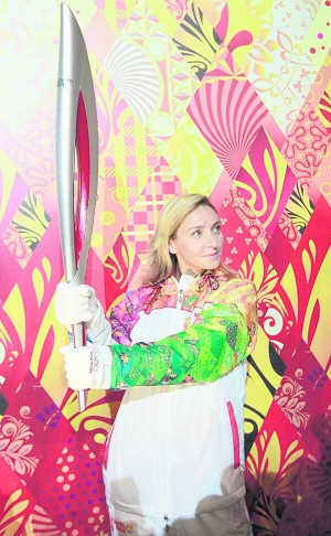 Тетяна Навка, олімпійська чемпіонка з фігурного катання, уродженка Дніпропетровська, у московському ГУМі представляє смолоскип для естафети до зимової Олімпіади-2014. Змагання відбудуться в Сочі. Факел має вигляд пера казкової жар-птиці. Зроблений із полімеру. Завважки 1,8 кг, завдовжки 0,95 м. На машинобудівному заводі Красноярська виготовлять 14 тисяч смолоскипів.