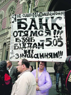 15 травня близько сотні людей з різних областей, які мають валютні кредити у фінустановах, протестували біля Нацбанку в Києві. Вимагали дозволити погашати борги гривнями за курсом на момент укладення договорів.