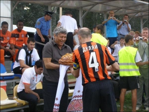 Перед матчем дівчата в українському вбранні виносять капітанові "Шахтаря" коровай. Дуляй куштує шматок, а що робити далі, не знає. Сербу підказують, що коровай потрібно забрати. Дуляй передає його Луческу. Футболістам вручають по букету айстр. Румун роздає їх уболівальницям на трибунах.