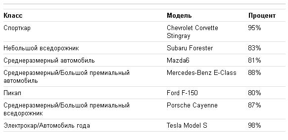 В прошлом году седан Tesla Model S получил в исследовании Consumer Reports 99 процентов положительных отзывов. В число лучших машин также попали Honda Accord, Subaru Impreza, Subaru Forester, Hyundai Santa Fe, Toyota Prius, Ram 1500, Audi A6, BMW 328i и Honda Odyssey.