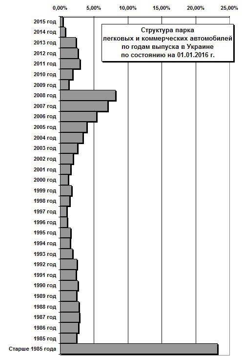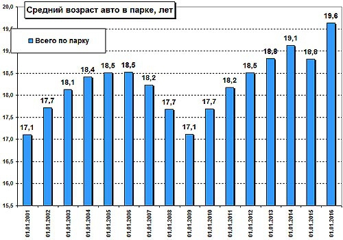 В то же время, незначительные продажи новых автомобилей и поставке подержанных автомобилей из-за границы негативно сказались на возрасте украинского автопарка. Так, на начало 2016 года по данным AUTO-Consulting средний возраст автомобиля во владении украинцев составил 19,6 лет. Это худший показатель за всю историю наблюдений за авторынком Украины.