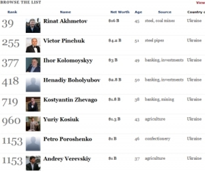 Среди украинских олигархов, которые попали в список журнала, также Виктор Пинчук (4,2 миллиарда долларов - 255 место), Игорь Коломойский (3 миллиарда долларов - 377 место), Геннадий Боголюбов (2,8 миллиарда долларов - 418 место).