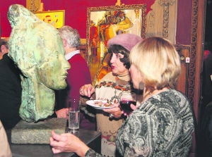 В трех залах художественного центра "Шоколадный дом" выставили работы современных украинских художников и скульпторов. В помещении шумно и душно. Гостей угощают вином и рыбой.