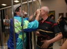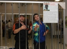 Также на выставке показывали живые инсталляции "Жлобопарк. Тваринолюды". Посередине зала в клетке сидели двое парней в спортивных костюмах. Они щелкали семечки и ели тарань. Отходы бросали себе под ноги. Недалеко от них за столом сидел парень в строгом костюме. Он символизировал чиновника-бюрократа.