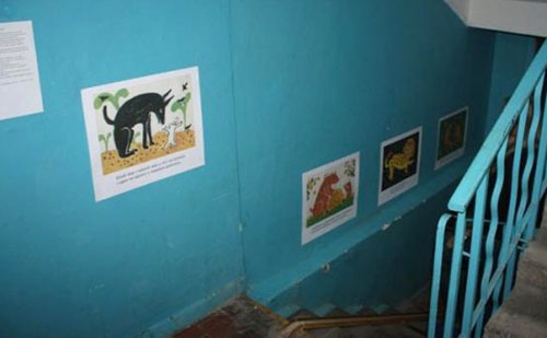 Репродукции картин художницы Юли Гушул развешивали не только инициаторы проекта, но и жители подъезда. Яркие рисунки украсили и лестничную клетку, и металлическая входная дверь, и кабину лифта.