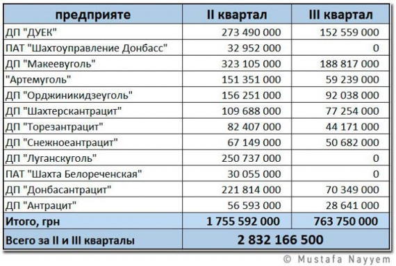 "Удалось выяснить, что в течение II и III кварталов 2014 года только предприятиям угольной промышленности в зоне ЛНР и ДНР было перечислено 2 832 166 500 грн. Напомню, все это время мы де-факто находились в состоянии войны с этими территориями, не контролировали фискальные органы, государственные администрации и не имели доступа ни к одному из указанных предприятий. Более того, с той стороны у нас постоянно стреляли, заставляя идти на огромные расходы для поддержки армии", - написал Найем.