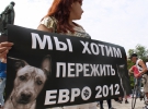 Отметим, что на нескольких плакатах были изображены фотографии убитых собак, лежащих в луже крови. А на футболке одной женщины была надпись "Fuck Euro 2012".