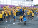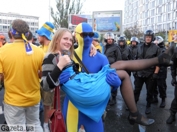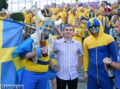 Фаны в наиболее оригинальной одежде интересуют украинцев. Белокурая девушка подходит к мужчине в комбинезоне в цветах сборной Швеции. Ее товарищ фотографируется с группой "викингов".