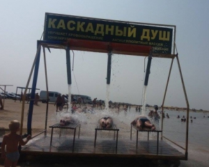 В этом году отдыхающим на пляже предлагали каскадный душ. Процедура выглядит достаточно интересно. Человек ложится, а с высоты около 3 метров на него льется вода под большим напором.