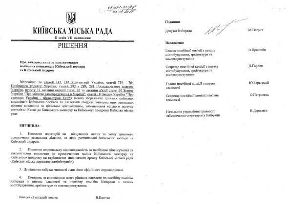 Депутат Киевского городского совета Николай Михайлович Негрич зарегистрировал проект постановления, который накладывает мораторий на отчуждение имущества земельных участков, на которых расположены Киевский столичный ипподром и зоопарк. Об этом сообщил сам депутат.