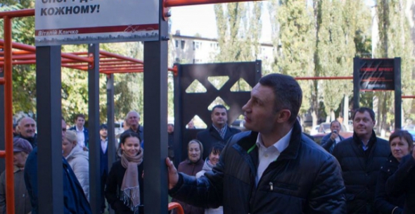 Виталий Кличко также протестировал новую спортплощадку и сделал "подъем-переворот".