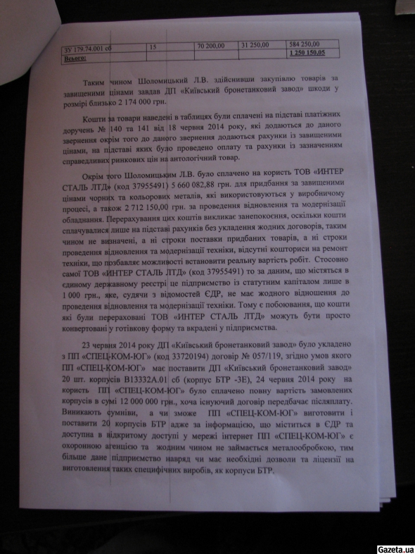 "Однако временный исполняющий обязанности директора КБТЗ Леонид Шоломицкий эти средства потратил на приобретение материалов и комплектующих по завышенным ценам, на оплату за разработку проектной документации системы видеонаблюдения, на приобретение корпусов БТРов не у специализированного производителя, а у охранной фирмы, которая их не сможет поставить", - говорится в сообщении.