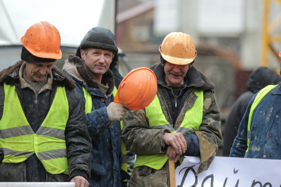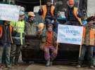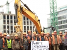 С плакатами, в рабочих манишках и касках более сотни строителей в разных уголках столицы вышли на забастовку против нападений "титушек" на стройплощадки.