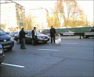 Вчера утром водители еле успели затормозить напротив остановки метро Политехнический институт (проспект Победы). На третью полосу внезапно приземлился огромный пеликан.