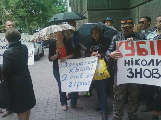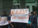 Люди держат в руках плакаты: "Требуем всесторонней проверки", "Спасибо, господин Кубив! Я стал жить хуже", "Кубива на нары", "Кубив, от люстрации не убежишь", "Кубив – услышь голос Майдана", "Не умеешь, не берись", "Доллар – 12? Спасибо, Степан".