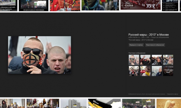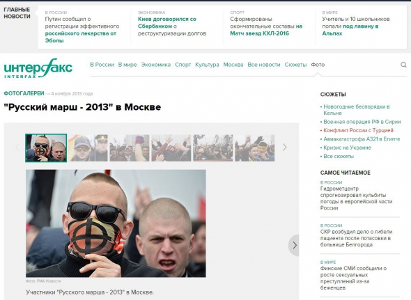 Однако оказалось, что фото в публикации было снято во время проведения в Москве Русского марша в 2013 году. Поисковик Google находит человека с этой повязкой в числе первых во время поиска фотографий марша этого года, а сама фотография с ним находится в галерее информационного агентства Интерфакс.