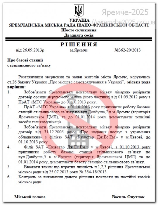 Как пишет издание Watcher, с задержкой в один месяц вступило в силу решение городского совета от 26.09.2013 о запрете мобильной связи на территории города Яремче, и которым расторгается договор аренды, на основании которого мобильные операторы располагали на территории города свои ретрансляционные вышки.