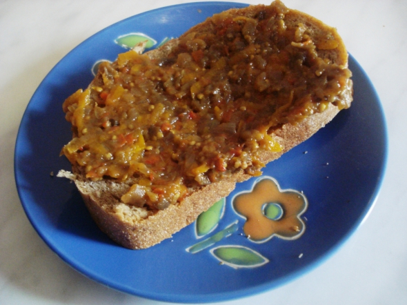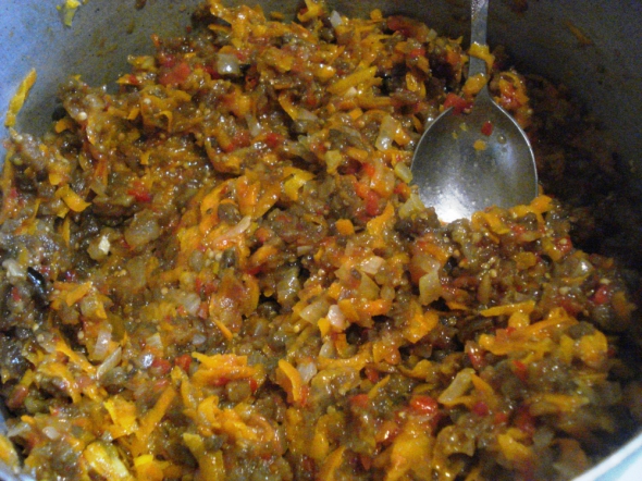 "К молотым баклажанам добавляем смесь овощей. Посолить и поперчить все. Тушить нужно полчаса. Когда смесь остынет, то ее переложить в тарелку и хранить в холодильнике".