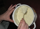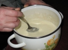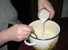 Приготовленную смесь переливают в кастрюльку. Ставят на огонь большую кастрюлю с водой и доводят ее до кипения. Затем кастрюлю со смесью аккуратно погружают в большую кастрюлю с кипящей водой и уменьшают огонь.