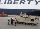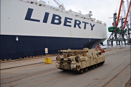 Сообщается, что с корабля Liberty Promise выгружены танки M1A2 Abrams, а также бронемашины пехоты M2A3 Bradley общим числом 120 единиц.