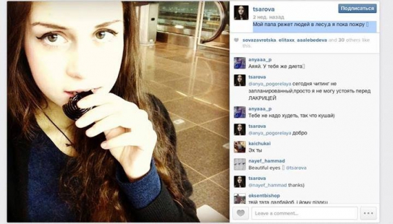 "Мой папа режет людей в лесу,а я пока пожру " - подписала под фото в Instagram дочка Царева.