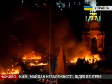Огонь на Майдане постепенно подбирается к сцене. Таким образом с одной стороны палаточный городок полностью охвачен огнем.