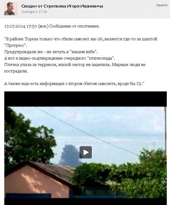 Однако, на тот момент он думал, что ополченцы сбили украинский самолет АН-26. Так, на странице "Сводки от Стрелкова Игоря Ивановича" (т.н. министр обороны "ДНР") в социальной сети "ВКонтакте" появилось "сообщение от ополчения", датированное 16:50 по киевскому времени следующего содержания: "В районе Тореза только что сбили самолет Ан-26, валяется где-то за шахтой "Прогресс". Предупреждали же - не летать в "нашем небе"… Птичка упала за террикон, жилой сектор не зацепила. Мирные люди не пострадали".