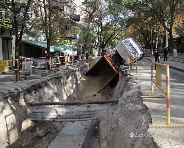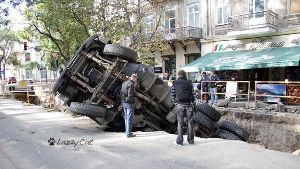 Об этом сообщил очевидец. По его словам, сегодня, приблизительно в 9 утра, грузовик перевернулся и ушел в яму целиком, оставив на поверхности только кабину водителя.