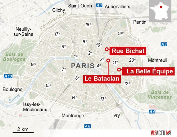 Согласно сообщению, произошла перестрелка в одном из баров в центре Парижа, также сообщается о нескольких взрывах.