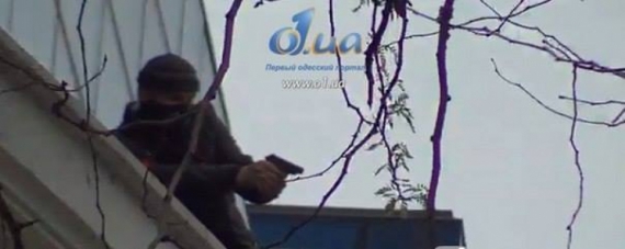 Одесским журналистам удалось заснять мужчину в камуфляжной форме и с георгиевской ленточкой на груди, который стрелял из пистолета по проукраинским активистам с крыши торгового центра "Афина".
