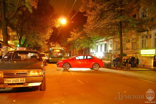 17 сентября около 21.00 движение транспорта в центре Одессы по улице Садовой было блокировано из-за красной иномарки, стоящей поперек дороги.