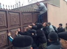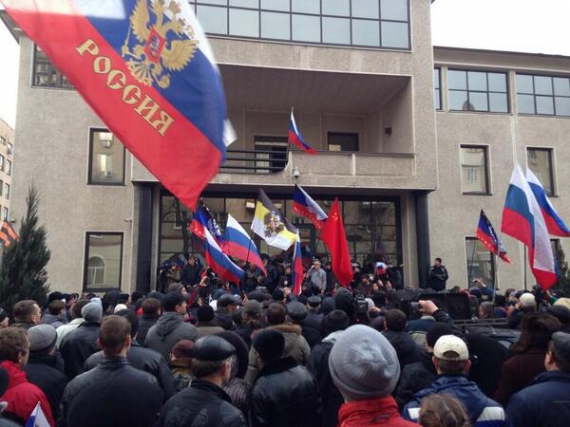 Несколько сотен сепаратистов зашли в здание офиса ИСД через двор, выломав двери черного входа. Они обвешивают здание флагами России, движения "Донецкая республика" и черно-желто-белыми флагами российских неонацистских организаций.