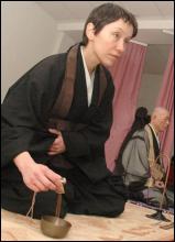 Занятия проводили в актовом зале киевской школы N87. На сцене разостлали простыни, поставили колокольчики. Когда я вошла в зал, на сцене с закрытыми глазами уже сидел в позе "лотоса" японец. Люди понемногу собирались. Эйки — хрупкая женщина с черной короткой прической — вошла босая, в просторном японском халате. Поздоровалась — сложенными ладонями притронулась ко лбу.