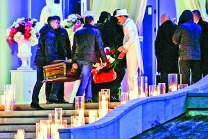 Около 16.00 подъезжают гости на дорогих машинах: джипах, "Мерседесах", "Тойотах". Много машин имеют номера Верховной Рады и Днепропетровска, где родились родители Евгении. На лестнице под перилами зажигают десятка два свечей. Колонны на входе подсвечивают синим.