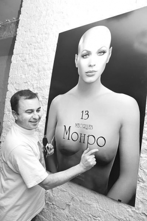 Певец 43-летний Виктор Павлик осторожно касается к голой груди Монро на фотографии. Брызгает на неех подарком — собственными духами Viktor Pavlik.